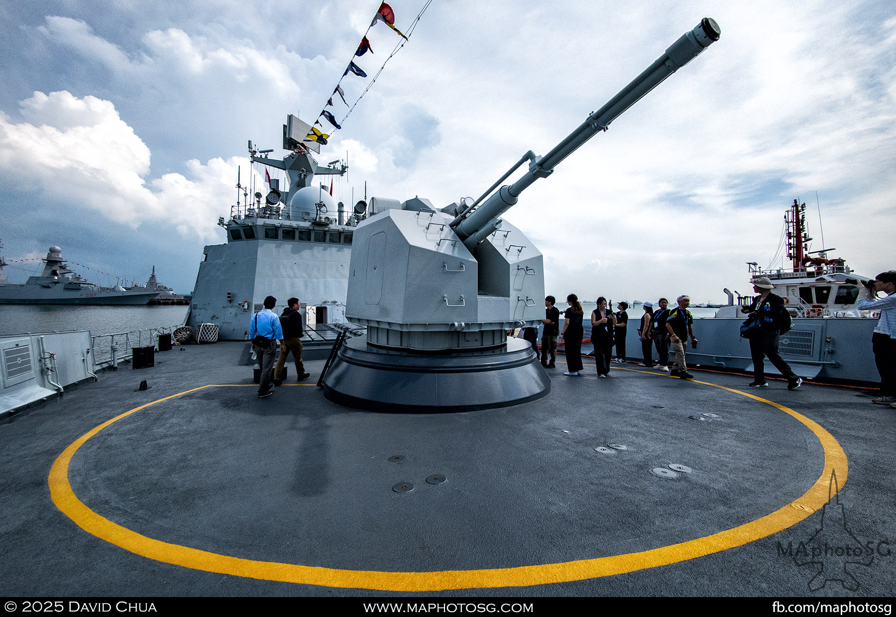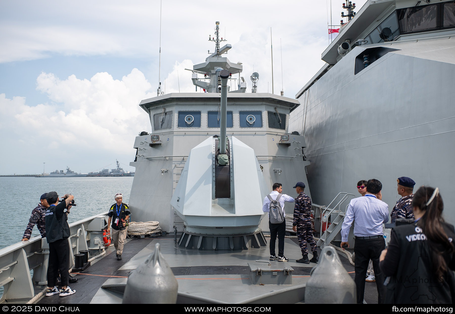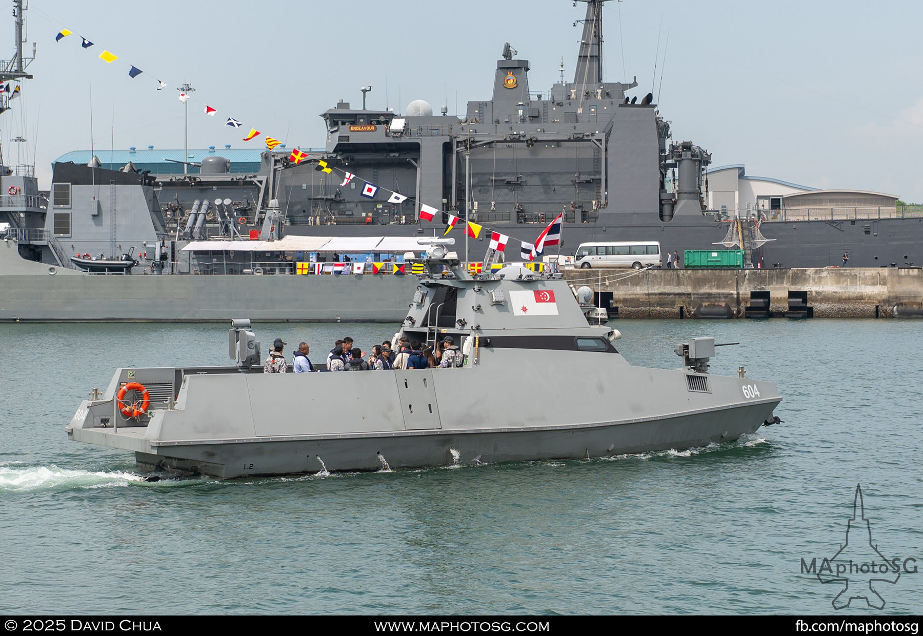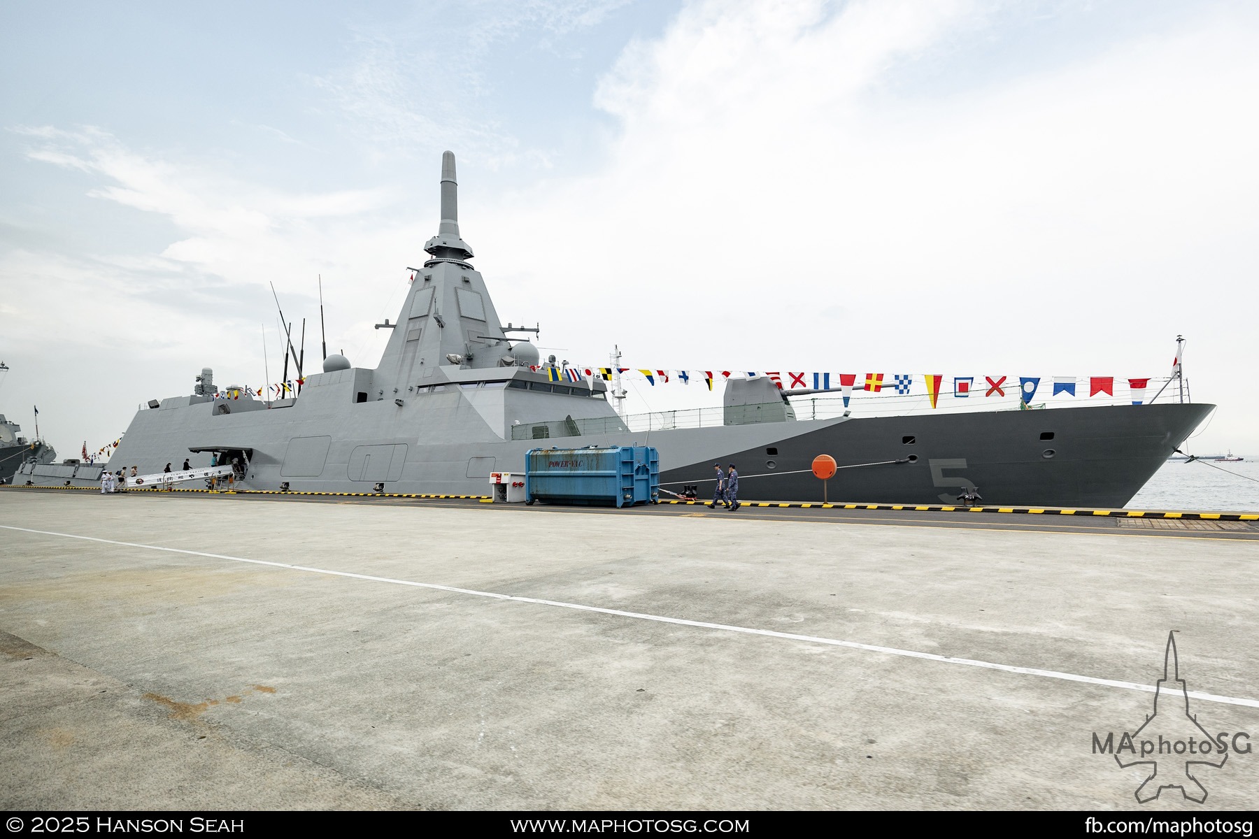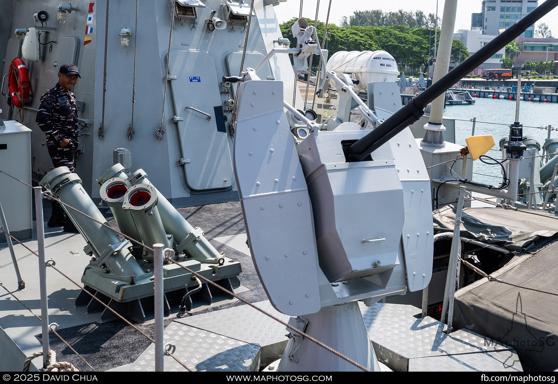 13. From left to right: KDB Darussalam, PLANS Xuchang, PLANS Chishui, SLNS Samudura.14. PLANS Xuchang, a Type 054A frigate of the People’s Liberation Army Navy (PLAN).15. The 32-cell vertical launching system (VLS) located on the bow of PLANS Xuchang.16. A single 76mm H/PJ26 naval gun located on the bow of PLANS Xuchang.17. PLAN patch worn by sailors aboard the Xuchang frigate.18. A Harbin Z-9C helicopter nested in the hangar of PLANS Xuchang.19. HTMS Prachuap Khiri Khan, a Krabi-class offshore patrol vessel (OPV) of the Royal Thai Navy (RTN).20. The Garuda—a renowned figure in Hindu and Buddhist mythology and the national emblem of Thailand—seen onboard HTMS Prachuap Khiri Khan.21. A patch worn by an RTN sailor commemorates 60 years of diplomatic ties between Singapore and Thailand.22. RTN sailors pose for a group photo.23. KRI Kerambit (left) and KRI Bung Karno (right) of the Indonesian Navy (TNI-AL).24. A TNI-AL sailor poses for a photo on the bridge of KRI Bung Karno.25. Polished furnishings on the bridge of KRI Bung Karno, which serves the unique role of a “VVIP Presidential Helicopter-Carrying-Missile Corvette.”26. Reception area onboard KRI Bung Karno.27. KRI Bung Karno is named after Indonesia’s first President, Sukarno.28. Conference room onboard KRI Bung Karno.29. The luxurious presidential suite onboard KRI Bung Karno.30. The main naval gun, the Bofors 57mm Mk3, on the bow of KRI Kerambit.31. The secondary gun, an M71/08 20mm autocannon, is located at the stern of KRI Kerambit.32. A sailor from the Royal Brunei Navy (TLDB) poses for a photo onboard KDB Darussalam.33. IMDEX Asia 2025 participation patch worn by a TLDB sailor.34. Bridge of KDB Darussalam.35. Communal area onboard RSS Dauntless of the Republic of Singapore Navy (RSN).36. Two slipways at the stern of RSS Dauntless allow for the rapid launch and recovery of RHIBs or USVs.37. RSS Tenacious (left) and RSS Intrepid (right), Formidable-class stealth frigates of the RSN.38. Bridge of RSS Tenacious.39. A military expert from RSS Tenacious explains duties carried out at the engineering station.40. Patch worn by a sailor from RSS Tenacious.41. An RSN sailor poses for photos on the helicopter deck of RSS Tenacious.42. Maritime Security Unmanned Surface Vessel (MARSEC USV) of the RSN.43. ITS Antonio Marceglia, a FREMM frigate of the Italian Navy. It is on a six-month Indo-Pacific campaign that saw participation in IMDEX Asia, LIMA, and the Osaka Expo.44. INS Kiltan, an anti-submarine warfare corvette of the Indian Navy.45. HMAS Arunta, an Anzac-class frigate of the Royal Australian Navy.46. HMS Spey, a Batch 2 River-class OPV of the Royal Navy.47. USS Dewey, an Arleigh Burke-class guided-missile destroyer of the United States Navy.48. JS Yahagi, a Mogami-class frigate of the Japan Maritime Self-Defense Force.49. KD Lekir, a Kasturi-class corvette of the Royal Malaysian Navy.50. RSS Endeavour, an Endurance-class landing ship tank of the RSN.