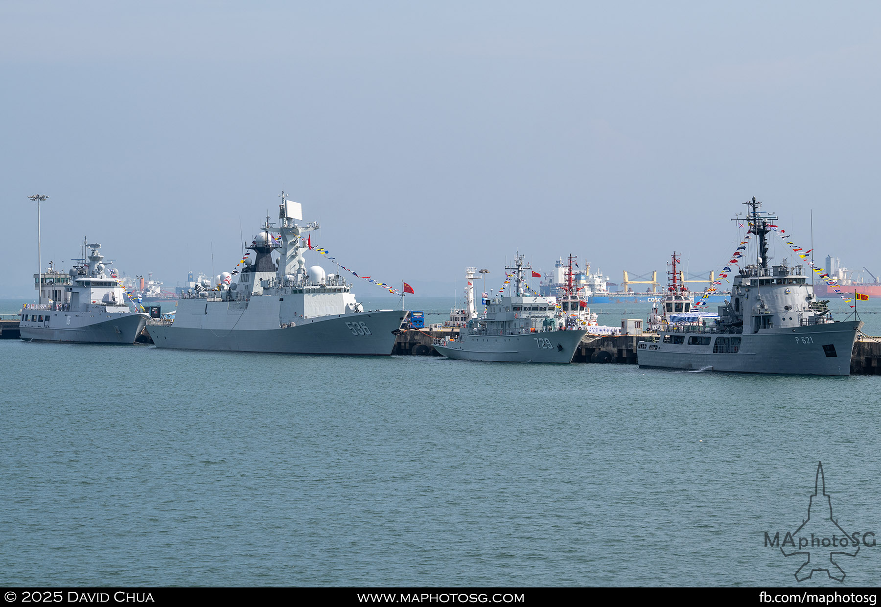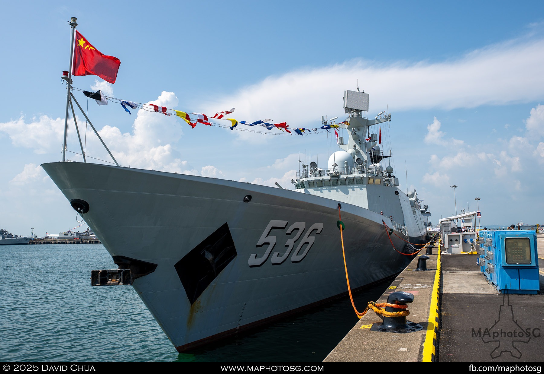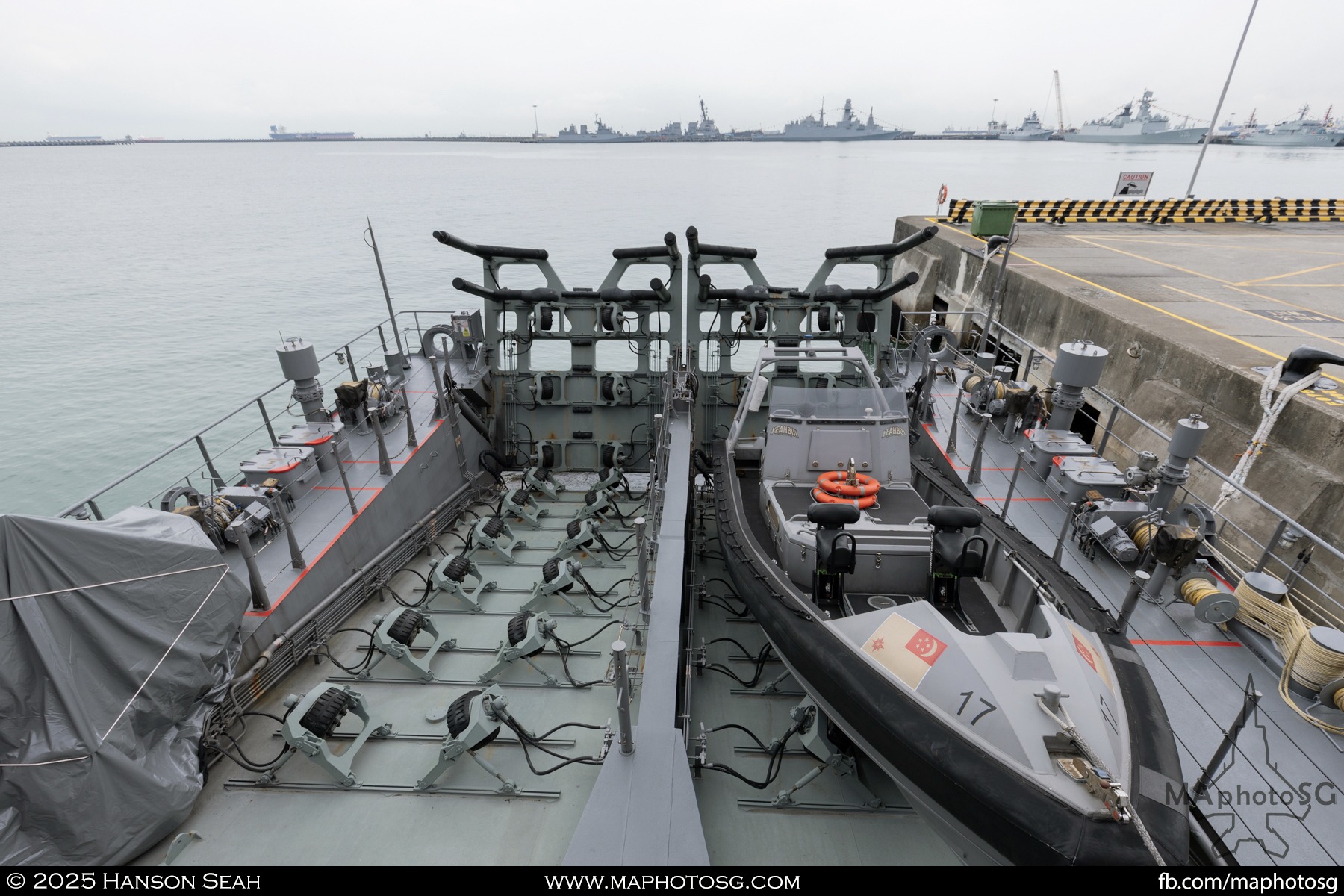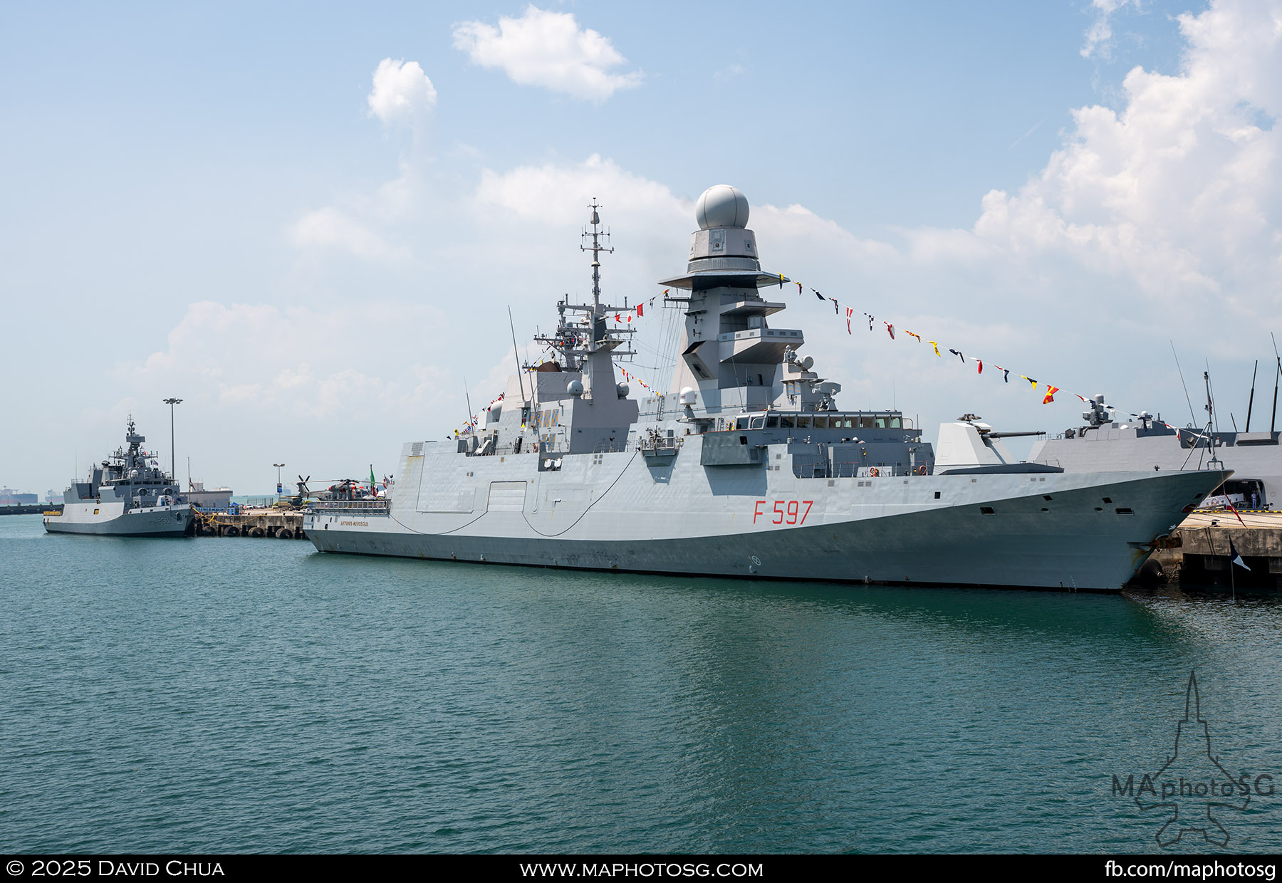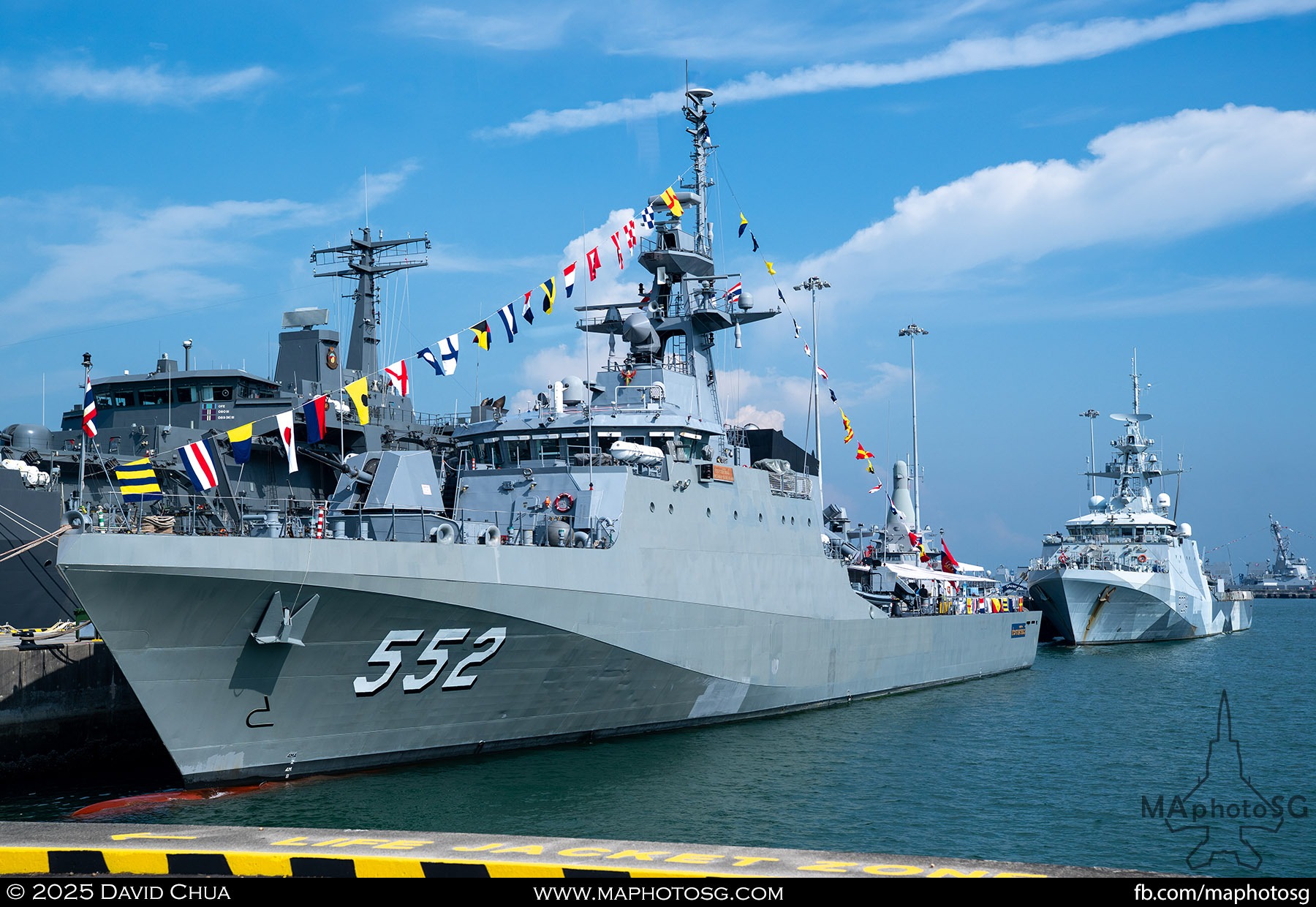 13. From left to right: KDB Darussalam, PLANS Xuchang, PLANS Chishui, SLNS Samudura.14. PLANS Xuchang, a Type 054A frigate of the People’s Liberation Army Navy (PLAN).15. The 32-cell vertical launching system (VLS) located on the bow of PLANS Xuchang.16. A single 76mm H/PJ26 naval gun located on the bow of PLANS Xuchang.17. PLAN patch worn by sailors aboard the Xuchang frigate.18. A Harbin Z-9C helicopter nested in the hangar of PLANS Xuchang.19. HTMS Prachuap Khiri Khan, a Krabi-class offshore patrol vessel (OPV) of the Royal Thai Navy (RTN).20. The Garuda—a renowned figure in Hindu and Buddhist mythology and the national emblem of Thailand—seen onboard HTMS Prachuap Khiri Khan.21. A patch worn by an RTN sailor commemorates 60 years of diplomatic ties between Singapore and Thailand.22. RTN sailors pose for a group photo.23. KRI Kerambit (left) and KRI Bung Karno (right) of the Indonesian Navy (TNI-AL).24. A TNI-AL sailor poses for a photo on the bridge of KRI Bung Karno.25. Polished furnishings on the bridge of KRI Bung Karno, which serves the unique role of a “VVIP Presidential Helicopter-Carrying-Missile Corvette.”26. Reception area onboard KRI Bung Karno.27. KRI Bung Karno is named after Indonesia’s first President, Sukarno.28. Conference room onboard KRI Bung Karno.29. The luxurious presidential suite onboard KRI Bung Karno.30. The main naval gun, the Bofors 57mm Mk3, on the bow of KRI Kerambit.31. The secondary gun, an M71/08 20mm autocannon, is located at the stern of KRI Kerambit.32. A sailor from the Royal Brunei Navy (TLDB) poses for a photo onboard KDB Darussalam.33. IMDEX Asia 2025 participation patch worn by a TLDB sailor.34. Bridge of KDB Darussalam.35. Communal area onboard RSS Dauntless of the Republic of Singapore Navy (RSN).36. Two slipways at the stern of RSS Dauntless allow for the rapid launch and recovery of RHIBs or USVs.37. RSS Tenacious (left) and RSS Intrepid (right), Formidable-class stealth frigates of the RSN.38. Bridge of RSS Tenacious.39. A military expert from RSS Tenacious explains duties carried out at the engineering station.40. Patch worn by a sailor from RSS Tenacious.41. An RSN sailor poses for photos on the helicopter deck of RSS Tenacious.42. Maritime Security Unmanned Surface Vessel (MARSEC USV) of the RSN.43. ITS Antonio Marceglia, a FREMM frigate of the Italian Navy. It is on a six-month Indo-Pacific campaign that saw participation in IMDEX Asia, LIMA, and the Osaka Expo.44. INS Kiltan, an anti-submarine warfare corvette of the Indian Navy.45. HMAS Arunta, an Anzac-class frigate of the Royal Australian Navy.46. HMS Spey, a Batch 2 River-class OPV of the Royal Navy.47. USS Dewey, an Arleigh Burke-class guided-missile destroyer of the United States Navy.48. JS Yahagi, a Mogami-class frigate of the Japan Maritime Self-Defense Force.49. KD Lekir, a Kasturi-class corvette of the Royal Malaysian Navy.50. RSS Endeavour, an Endurance-class landing ship tank of the RSN.