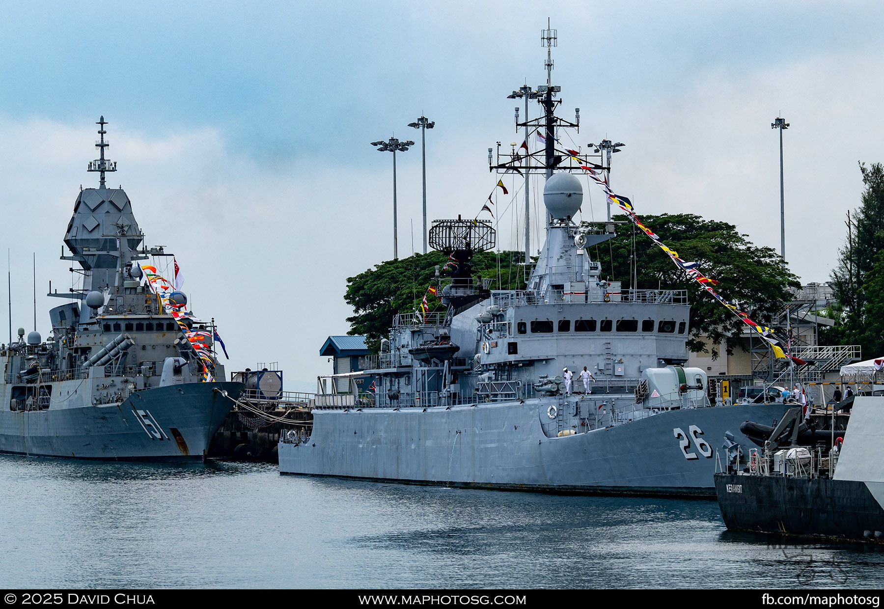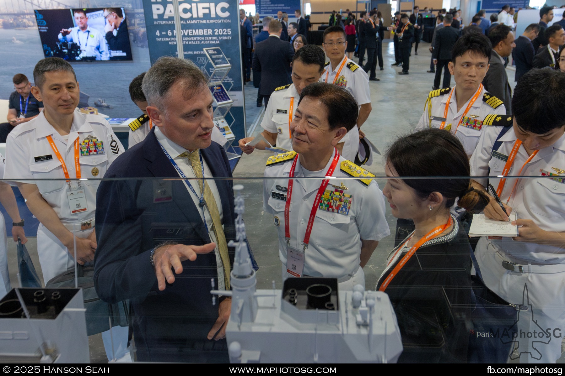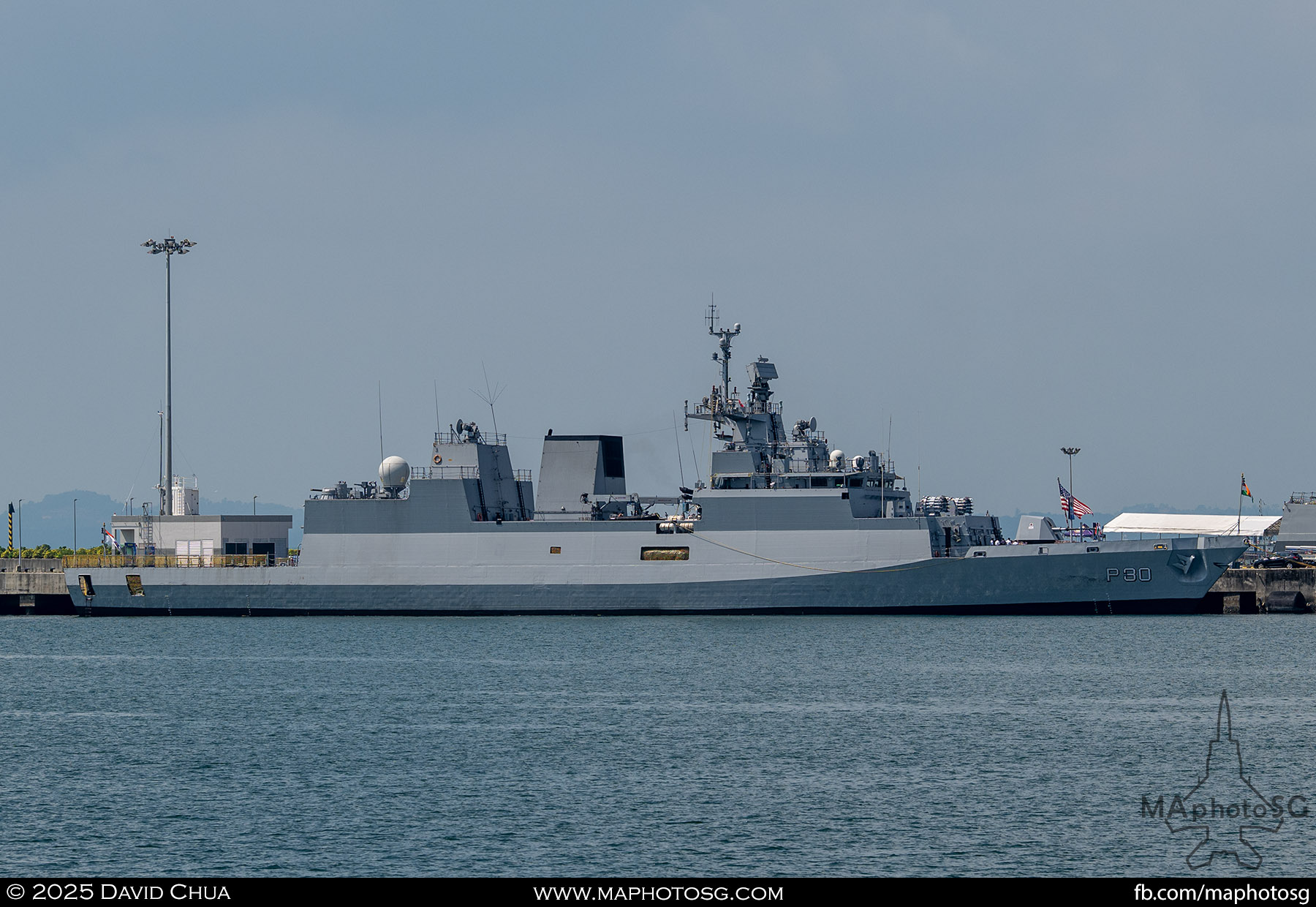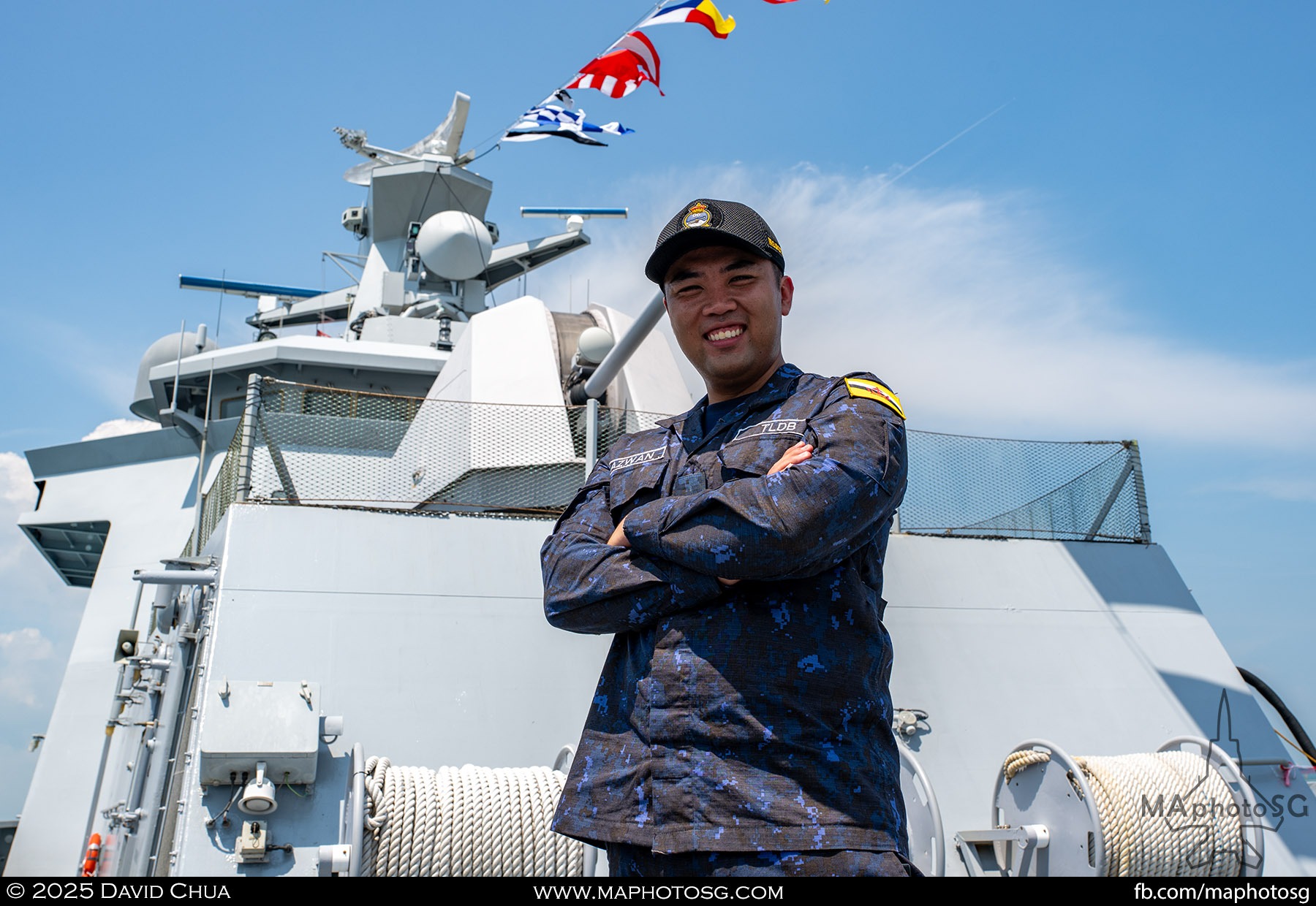 13. From left to right: KDB Darussalam, PLANS Xuchang, PLANS Chishui, SLNS Samudura.14. PLANS Xuchang, a Type 054A frigate of the People’s Liberation Army Navy (PLAN).15. The 32-cell vertical launching system (VLS) located on the bow of PLANS Xuchang.16. A single 76mm H/PJ26 naval gun located on the bow of PLANS Xuchang.17. PLAN patch worn by sailors aboard the Xuchang frigate.18. A Harbin Z-9C helicopter nested in the hangar of PLANS Xuchang.19. HTMS Prachuap Khiri Khan, a Krabi-class offshore patrol vessel (OPV) of the Royal Thai Navy (RTN).20. The Garuda—a renowned figure in Hindu and Buddhist mythology and the national emblem of Thailand—seen onboard HTMS Prachuap Khiri Khan.21. A patch worn by an RTN sailor commemorates 60 years of diplomatic ties between Singapore and Thailand.22. RTN sailors pose for a group photo.23. KRI Kerambit (left) and KRI Bung Karno (right) of the Indonesian Navy (TNI-AL).24. A TNI-AL sailor poses for a photo on the bridge of KRI Bung Karno.25. Polished furnishings on the bridge of KRI Bung Karno, which serves the unique role of a “VVIP Presidential Helicopter-Carrying-Missile Corvette.”26. Reception area onboard KRI Bung Karno.27. KRI Bung Karno is named after Indonesia’s first President, Sukarno.28. Conference room onboard KRI Bung Karno.29. The luxurious presidential suite onboard KRI Bung Karno.30. The main naval gun, the Bofors 57mm Mk3, on the bow of KRI Kerambit.31. The secondary gun, an M71/08 20mm autocannon, is located at the stern of KRI Kerambit.32. A sailor from the Royal Brunei Navy (TLDB) poses for a photo onboard KDB Darussalam.33. IMDEX Asia 2025 participation patch worn by a TLDB sailor.34. Bridge of KDB Darussalam.35. Communal area onboard RSS Dauntless of the Republic of Singapore Navy (RSN).36. Two slipways at the stern of RSS Dauntless allow for the rapid launch and recovery of RHIBs or USVs.37. RSS Tenacious (left) and RSS Intrepid (right), Formidable-class stealth frigates of the RSN.38. Bridge of RSS Tenacious.39. A military expert from RSS Tenacious explains duties carried out at the engineering station.40. Patch worn by a sailor from RSS Tenacious.41. An RSN sailor poses for photos on the helicopter deck of RSS Tenacious.42. Maritime Security Unmanned Surface Vessel (MARSEC USV) of the RSN.43. ITS Antonio Marceglia, a FREMM frigate of the Italian Navy. It is on a six-month Indo-Pacific campaign that saw participation in IMDEX Asia, LIMA, and the Osaka Expo.44. INS Kiltan, an anti-submarine warfare corvette of the Indian Navy.45. HMAS Arunta, an Anzac-class frigate of the Royal Australian Navy.46. HMS Spey, a Batch 2 River-class OPV of the Royal Navy.47. USS Dewey, an Arleigh Burke-class guided-missile destroyer of the United States Navy.48. JS Yahagi, a Mogami-class frigate of the Japan Maritime Self-Defense Force.49. KD Lekir, a Kasturi-class corvette of the Royal Malaysian Navy.50. RSS Endeavour, an Endurance-class landing ship tank of the RSN.