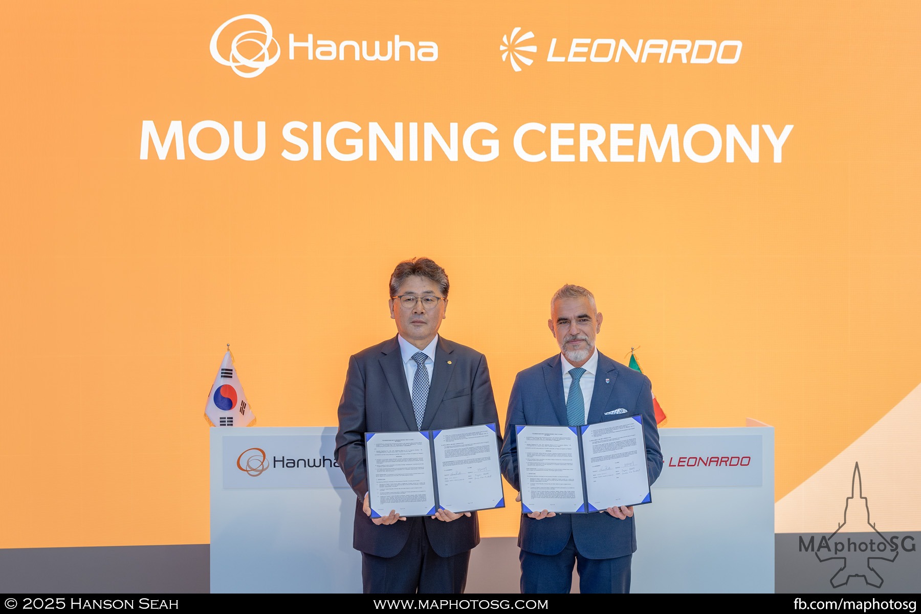 A memorandum of understanding (MoU) signing ceremony between Leonardo and Hanwha Systems to explore new cooperation opportunities in the electro-optical/infrared (EO/IR) domain. The two companies previously collaborated on the KF-21’s AESA radar and IRST, and are also proposing the Grifo EK radar.