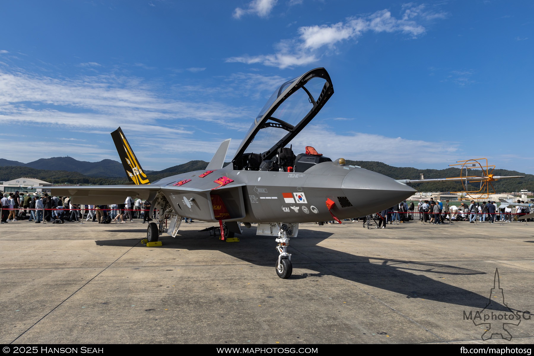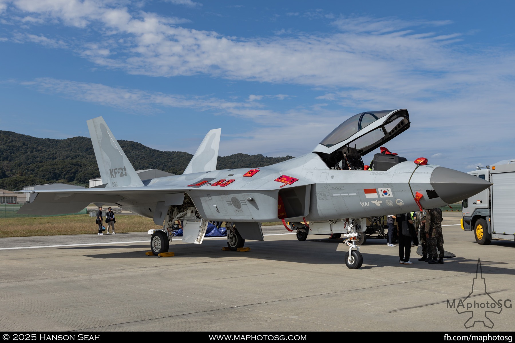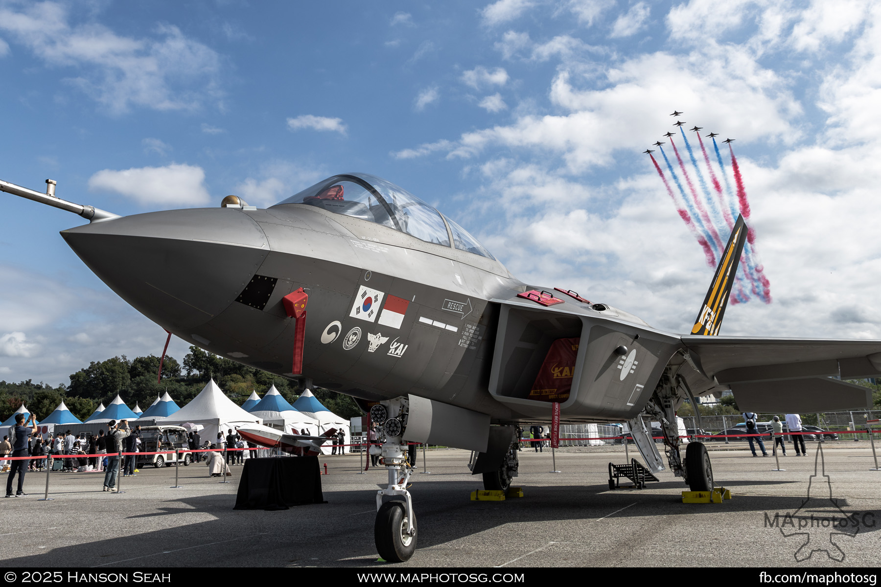 KAI KF-21 on static display, with the ROKAF Black Eagles performing the opening “Big Arrow” flypast in the background.